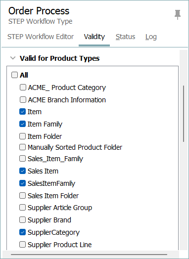 The Validity tab allows for specification of which object types the workflow is valid for. Only objects of the selected types can be initiated into the workflow. Notice that while a workflow can be made valid for multiple object types of a specific node type, it cannot be valid for object types of different node types. For example, a workflow can be valid for multiple types of entities, but not for both entities and classifications.