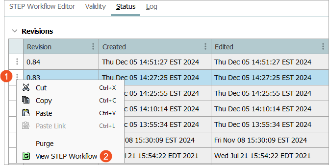 Previous versions of STEP Workflows can be viewed by selecting the revision on the Status tab, right-clicking on the row indicator (>), and selecting View STEP Workflow.
