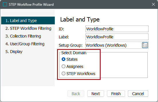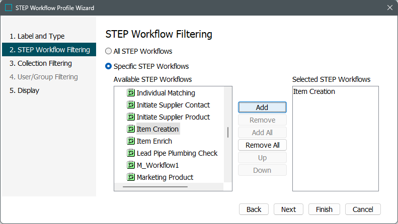 For STEP Workflow Filtering, determine the workflows or workflow states (within one or multiple workflows) that the profile should contain as defined below.