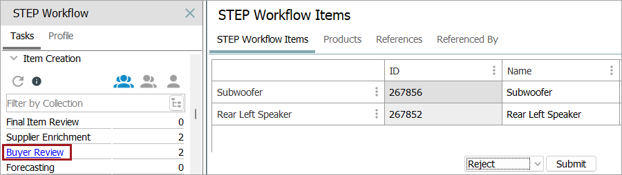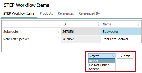 To submit a task, select the task (multi-select is enabled using Ctrl + click), choose the appropriate selection from the dropdown (if applicable), and click Submit. The available options for selection are configured in the STEP Workflow Designer. In some cases, only a single selection is present and therefore, it is not required to select a specific transition.