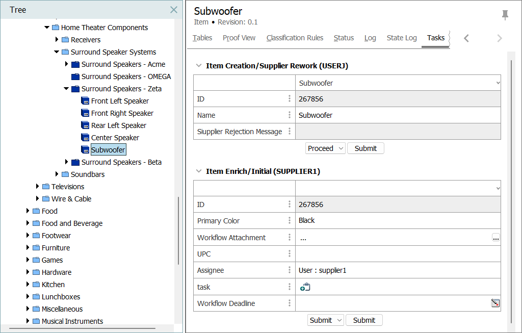 In a workflow, supplier users can only view objects that are directly linked to their supplier classification. Objects that are children to blue folders within a classification folder are not available to supplier user workflow tasks. For example, in the following image, the speaker products are not available for workflow tasks because they are child objects to the 'Surround Speakers - Zeta' product folder. The 't-shirt' objects can be worked as tasks because they have a direct link to a classification folder.