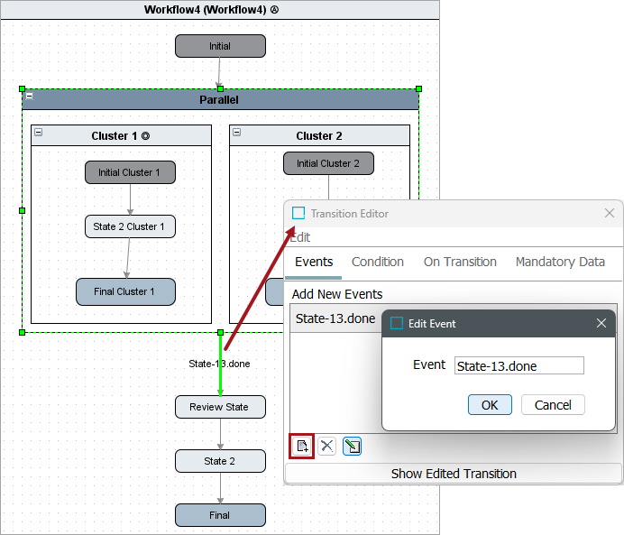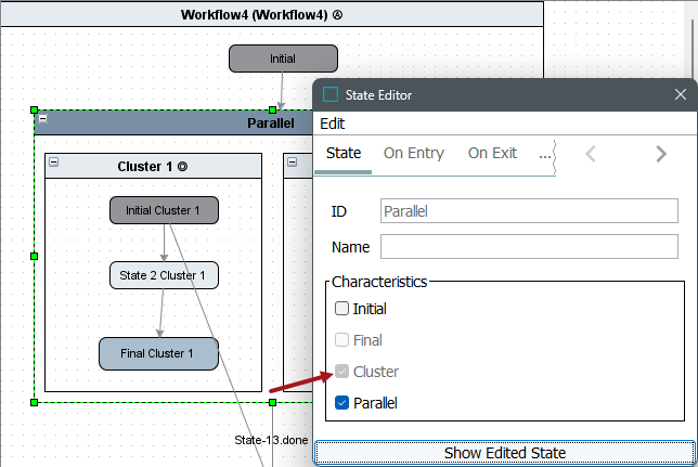 The Parallel characteristic is used for implementing two or more clusters simultaneously in the workflow. A Parallel state will automatically get the cluster characteristic indicating that it can only contain clusters as its immediate sub-states.
