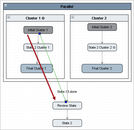 The image below shows an alternate way of configuring a parallel and transition relationship. There is a transition from Initial Cluster out of the parallel straight to Review State. If this transition is performed, the entire parallel and all its sub-states will be exited regardless of which state the object is in for Cluster 2.