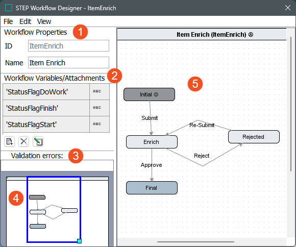This topic provides an overview of the STEP Workflow Designer, including descriptions of the various sub-editors and visual indicators within the designer. It is intended to orient you with the interface and provide general information for where to accomplish things in the designer, rather than to complete any specific task itself. When applicable, links to more detailed task-oriented materials are provided.