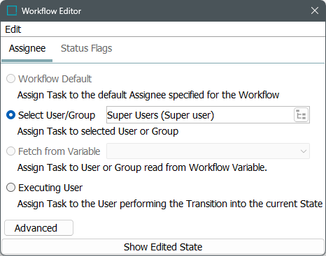 Modify the assignee for the entire workflow. Refer to the Workflow State Editor Assignee Tab Options topic.