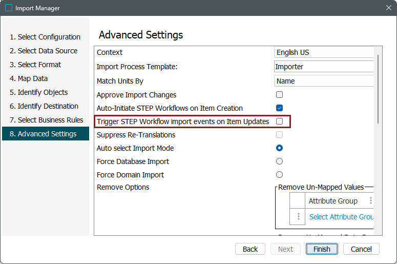 To turn on this functionality for a workflow, select the desired workflow in System Setup and check the Listen on updates from import checkbox on the STEP Workflow Editor tab.