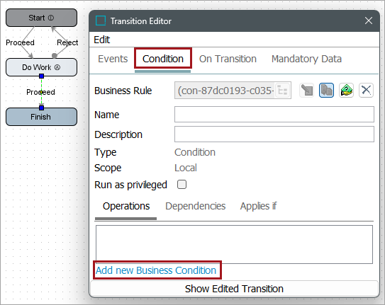 1. Double-click on the transition, select the Condition tab, then click the Add new Business Condition link.