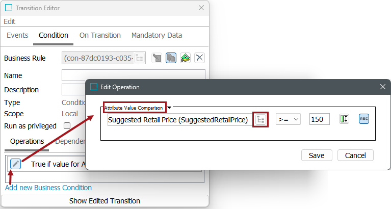 The below example will check to ensure that an attribute, List Price, has a value greater than or equal to .99. It assumes that a workflow has already been created and a transition exists on which the condition can be added.