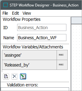 A bound workflow variable is tied to a STEP Attribute and gets its validation from the STEP Attribute. The description attribute must be externally maintained, non-dimension dependent, and must not be valid for any object type. Additionally, bound workflow variables have access to the corresponding attribute editor when a user chooses to display them in the workbench views (refer to the Views and Mappings for Workflows topic).
