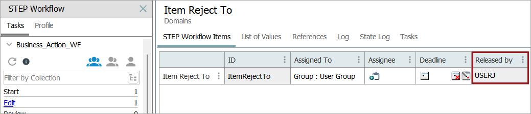 With this business action in place, when a product is submitted, the business rule is executed and the user ID of the user who submitted the product is stored. If this was mapped in the views and mappings View Editor, this is visible in the STEP Workflow Items tab.
