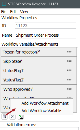 In the 'Workflow Variables/Attachments' section, click the add button and select 'Add Workflow Variable'.