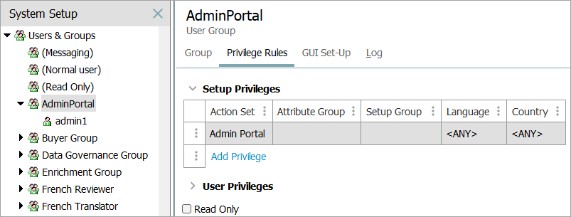 To access the admin portal, the person attempting to log in must have a user created in STEP that is a member of a user group with privileges that include the following setup actions: