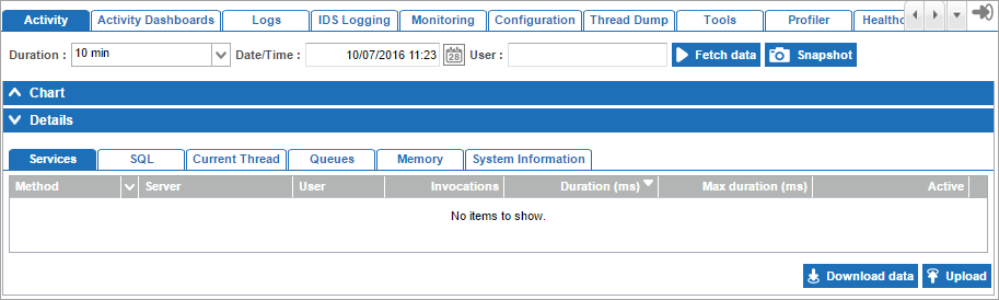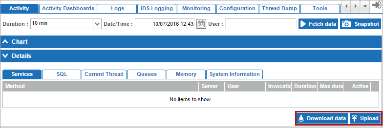 In the lower right corner of the Details section, Download data and Upload buttons are available for sending and/or viewing activity information. For example, if Stibo Systems does not have direct access to a system but it is necessary to provide activity data to them for support activities, the data can be downloaded using the Download data button. This could then be sent to Stibo Systems, who could upload it to view the data contained in the package. However, as with the Snapshot functionality, it is preferred that the Send Diagnostics feature be used in place of this to ensure that the complete set of relevant information is sent. Refer to the Send Diagnostics topic for more information.