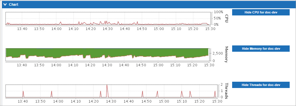 The Chart section of the interface displays a graphical representation of the data, per the query parameters. CPU, Memory, and Thread usage are displayed, along with buttons to hide the displays if needed.