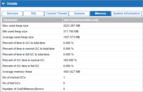 Note: Data is only available on this tab if Java Garbage Collection has been run on the system.