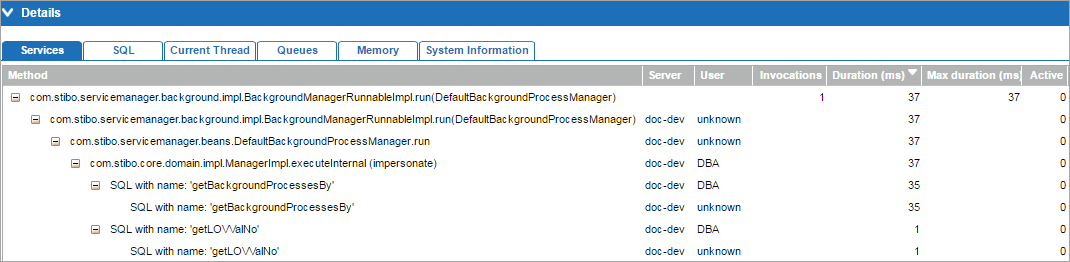 The Services tab details the profiling information gathered from the systems services, allowing users to drill down into different service calls inside the application. By default, method calls are sorted by duration. Therefore, if users are experiencing performance problems, it is possible to identify long running method calls that could be contributing to the issue. Additionally, this information can be used to determine whether it is core STEP functionality or a custom extension that is contributing to the issue. However, some interpretation of the data is required so this information is typically used only by Stibo Systems Technical Support.