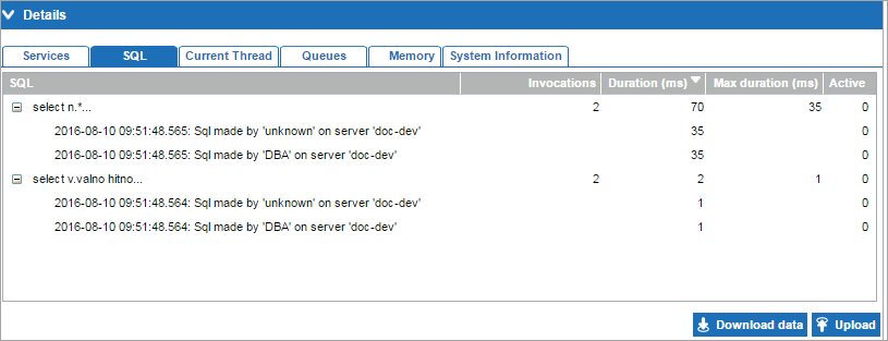 The SQL tab displays the SQL queries that have been executed by the system services. This is similar to the information shown on the Services tab, but reports on the use of SQL queries rather than standard methods. As with the Services tab, these items are also sorted by duration, which can assist in identifying long running queries that could be causing performance issues. However, the information is typically only used by Stibo Systems Technical Support as some interpretation of the data is required.
