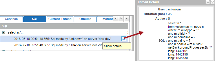 Users may hover on a row to expose the ellipsis button (). When clicked, a Thread Details popup is provided that displays the full SQL statement.