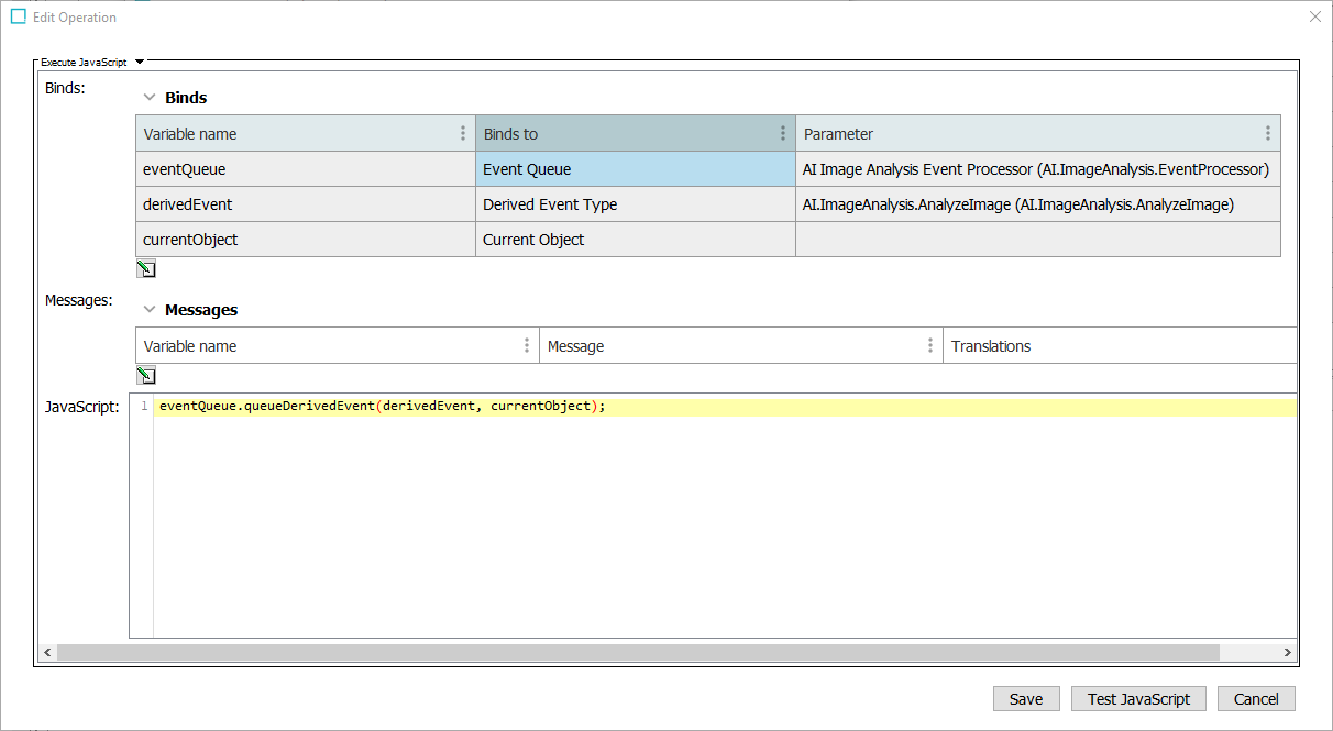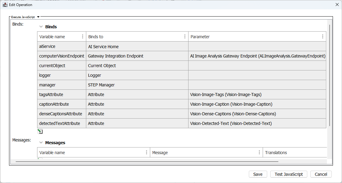 1. To make this example work, lastly, configure the Image Analysis Business Action. A bind must be made to the relevant gateway integration endpoint and attributes to produce the relevant tags, caption, description, and detected text.