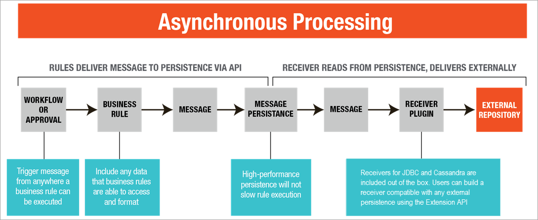 - Business rules are executed to deliver messages asynchronously to persistence via the API