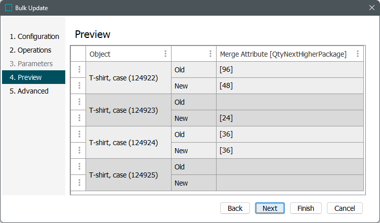 - Setting the operation parameters as 'Qty of Next Lower Package' for the source, 'Qty of Next Higher Package' for the target, using the Overwrite existing values, and setting Merge Link Attribute = Yes results in this preview of resulting values: