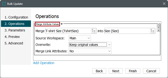 - For Merge Link Attributes, use the dropdown to select one of the following options. If the selected attributes are both used as an attribute on a reference, a product classification link, or an attribute link, merging of those values are based on the Yes or No set in this parameter, as well as the other parameters on the operation. This option is not relevant when values do not exist on references for the selected attributes.
