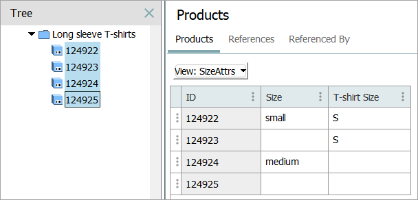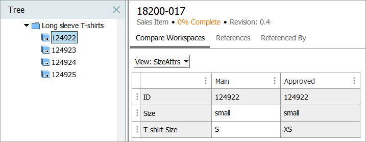 Consider the following example data, and assume that Overwrite existing values is selected (as described above). Selecting the Source Workspace = Main will result in writing the T-shirt Size value of S, while selecting Source Workspace = Approved will write the XS value.