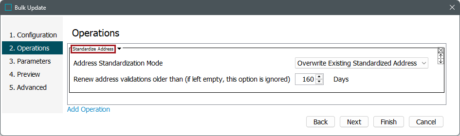 This documentation topic describes the options available when configuring a Standardize Address bulk update operation. For more detailed information on the overall Loqate solution, refer to the Loqate Integration section of the Data Integration documentation.