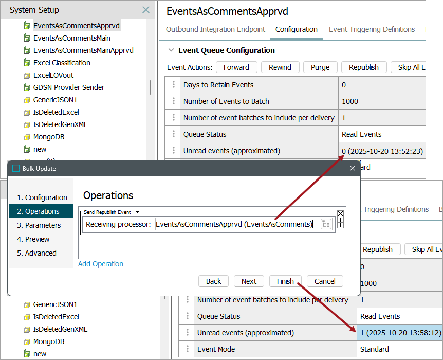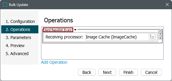 This option performs the same operation as selecting 'Republish' on a receiving processor. A republish event is sent to the event queue of the selected processor for all objects selected for the bulk update.