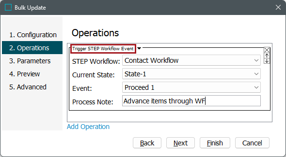 For more on triggering STEP Workflow events, the Bulk Update Operations for Workflows topic in the Workflows documentation.