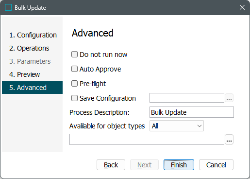 Do not run now runs the bulk update later, and not immediately when the wizard is finished. This allows a user to save the configuration. When checked, the Auto Approve and Pre-flight parameters are disabled.