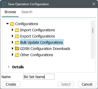 ) to display the 'Save Operation Configuration' dialog. To name a new configuration, select a folder and type a name in the Name parameter, and click Create. To overwrite an existing configuration, select the configuration and click Select.