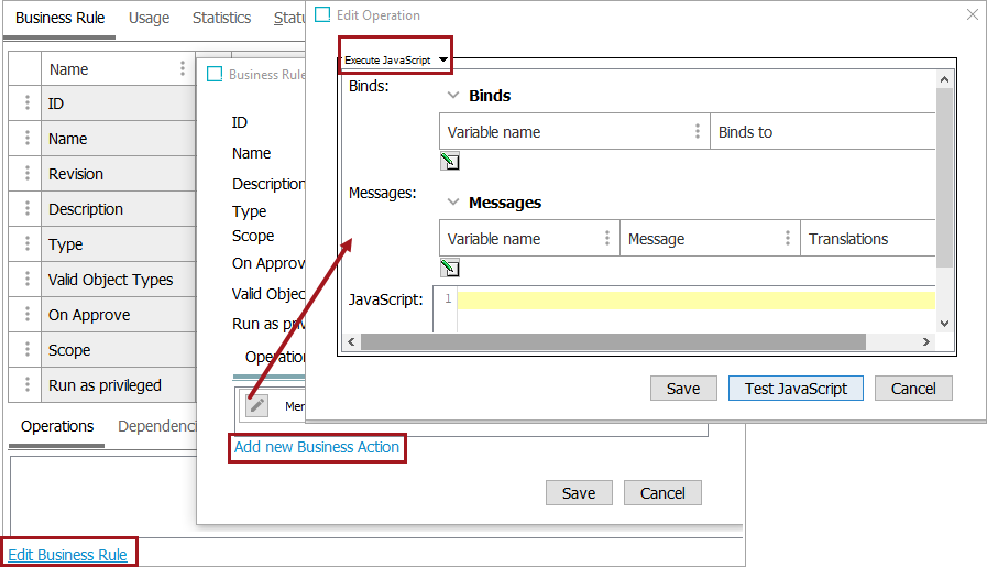 • Click the Save button to keep the modifications (including changes to JavaScript) and add the operation to the business rule editor.