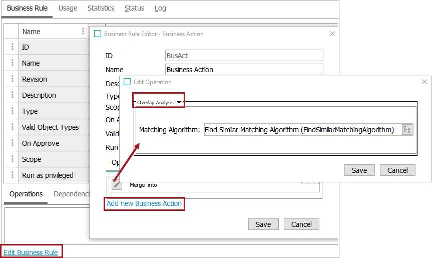 ) to display the Select a Matching Algorithm dialog, select an algorithm, and click the Select button. - Click the Save button to add the operation to the business rule editor.
