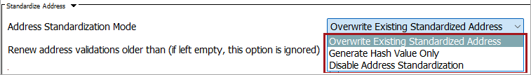- Overwrite Existing Standardized Address: Overwrites an existing standardized address by making a call to Loqate, which returns the latest standardized address and overwrites the existing one.
