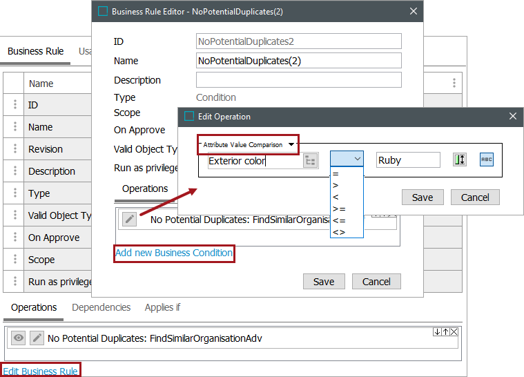 - Edit the business rule to configure the operation as defined in Editing a Business Rule or Function topic.