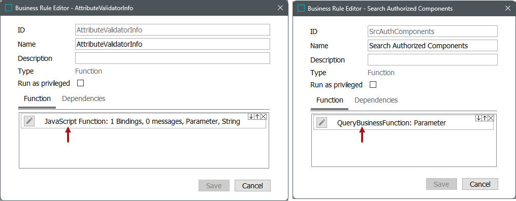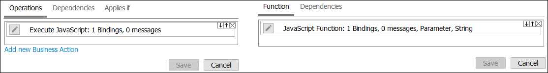 For functions, the Business Function Editor includes options about the operation provided via the Query Template Builder or the JavaScript included on the Edit Operation dialog (accessed by clicking an edit button on the Function tab). For more information on setting up business functions, refer to the Calling a Business Function from a JavaScript Business Rule topic.