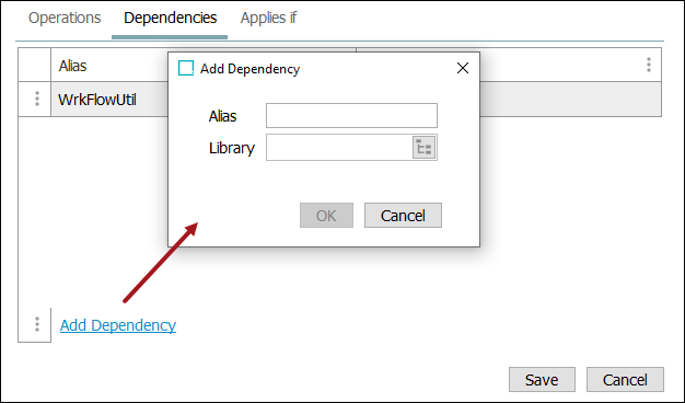 To add a dependency, click the Add Dependency link, and type an alias. Then click the ellipsis button (