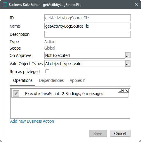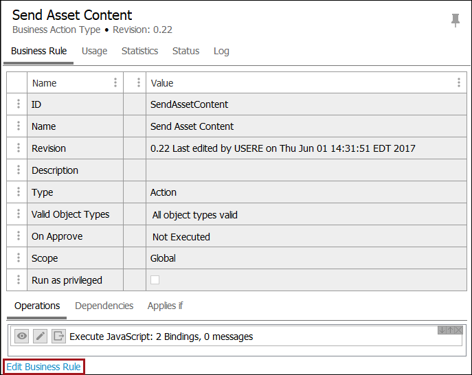 For actions and conditions, the Business Rule Editor allows you to modify most parameters on a business rule. However, the ID, Type, and Scope, cannot be edited and are shown with read-only text. Additional configuration is performed on the Edit Operation dialog (accessed by clicking an edit button on the Operations tab).