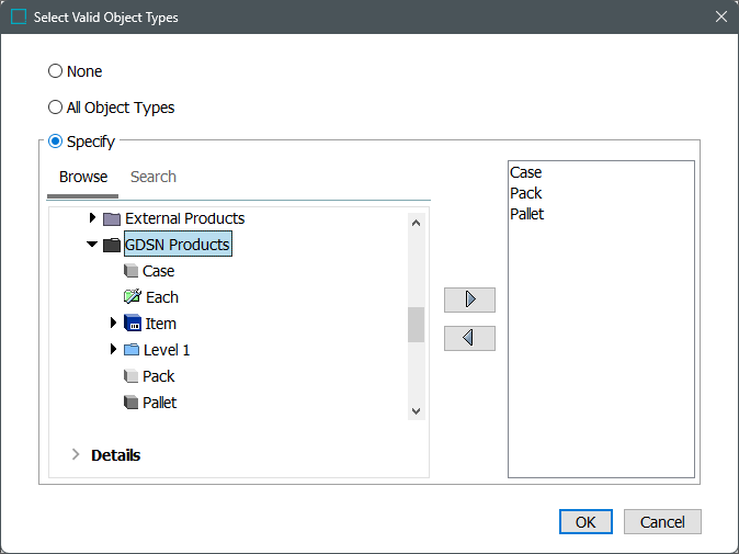 Use the Browse or Search tab to identify and select the desired object type, Click the move right button (