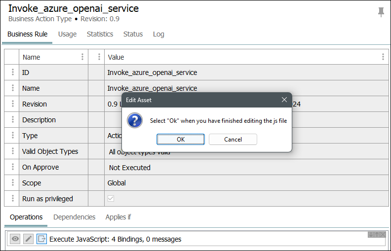 After opening an operation in VS Code, an 'Edit Asset' prompt displays in STEP and remains open until the user either clicks OK to accept changes made to the JavaScript file or clicks Cancel to disregard changes.