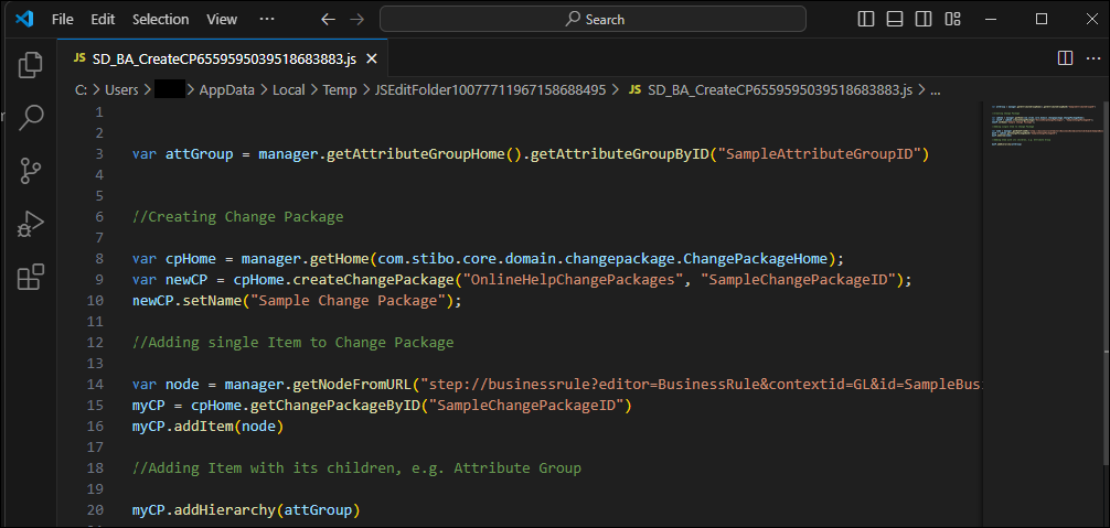 In the desired editing program, a temporary JavaScript file is generated and opened. VS Code is shown in the screenshots below.