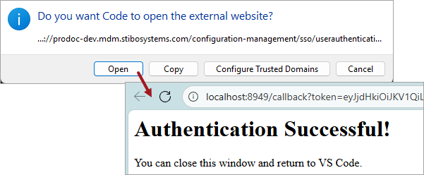 The first time you click the ‘Run and debug’ button for a STEP business rule, a prompt is displayed to open an external website for security reasons. Click the Open button to verify successful authentication. The authentication check is renewed every hour.