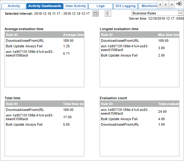 - The Admin Portal provides the possibility to track and trace business rule performance over a given period. From the Admin Portal, under Activity Dashboard, select Business Rules from the top right dropdown.