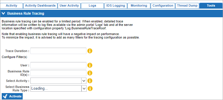 Note: Enabling business rule tracing will have a negative impact on performance. To minimize the impact, it is advised to add as many filters for the tracing configuration as possible.