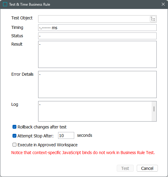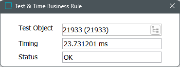 Once this option is selected, the 'Test & Time Business Rule' dialog will display. The 'Test Object' field needs to be populated with any objects that are valid for the business rule.