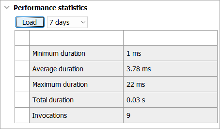 The following screenshot shows the same business rule which was invoked 9 times during the last seven days. Through these invocations, an average duration of about 3.78 ms was calculated. If the maximum duration value of 22 ms is selected, the workbench will navigate to the record that caused the slowest time to complete.