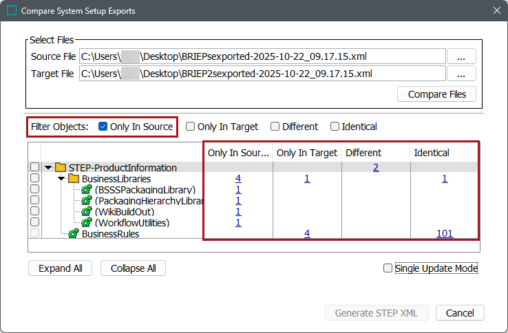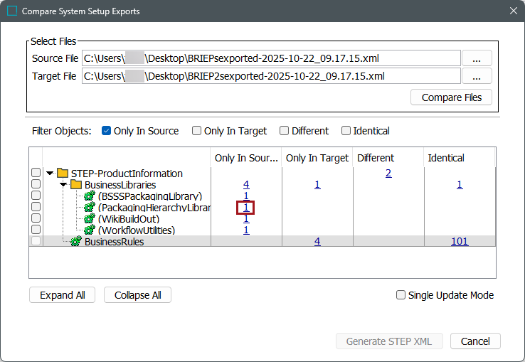 In this example, the user has selected to filter on ‘Only In Source.’ When the user opens the business libraries node, only the business libraries in the source system display.