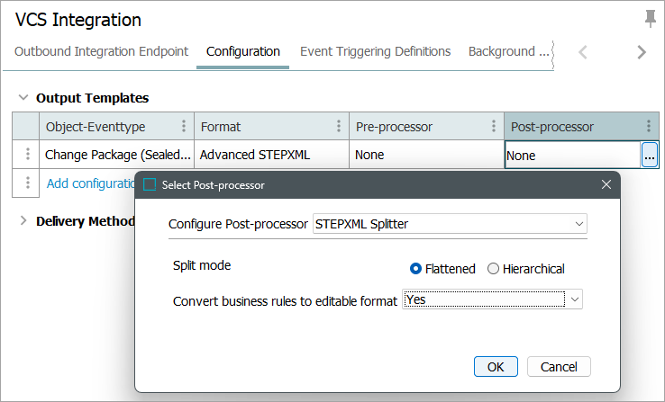 For the Change Package Git Delivery method, the STEPXML Splitter is integrated into the delivery method, so the STEPXML Splitter post-processor must not be added to the OIEP.