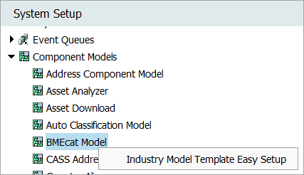 In the System Setup tab, under the 'Component Models' node, right-click on the BMEcat Model component model and select Industry Model Template Easy Setup.